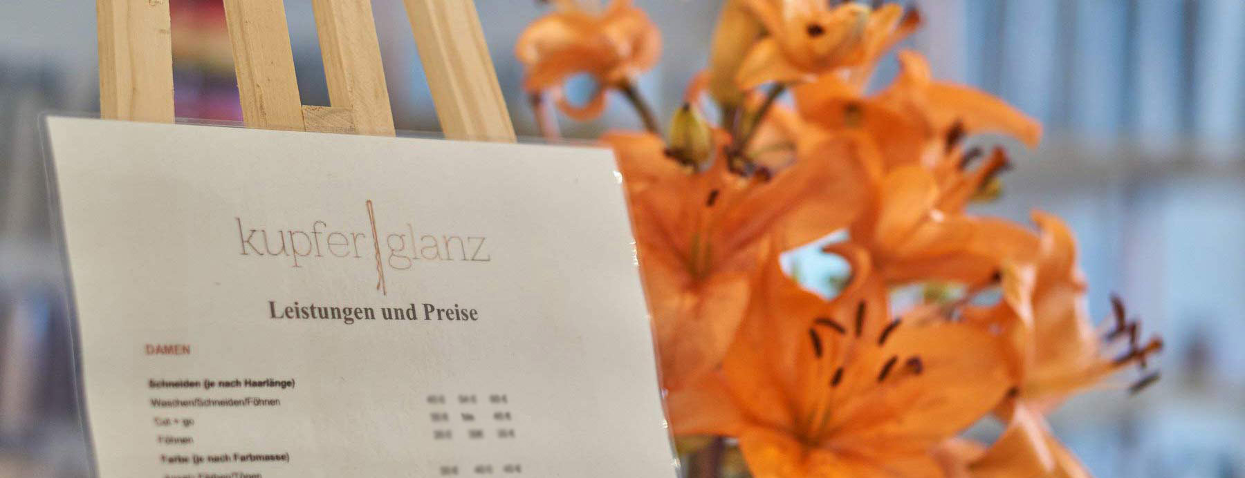 Herzlich willkommen bei Kupferglanz – Ihrem Friseur in Mönchengladbach. In allen Preisen enthalten sind die gesetzliche MwSt. sowie eine ausführliche Beratung zu Frisuren und Typfragen. Gerne nehmen wir uns Zeit, um Ihren Friseurbesuch so angenehm wie möglich zu gestalten. In unserer angenehmen Atmosphäre stehen Sie im Mittelpunkt.